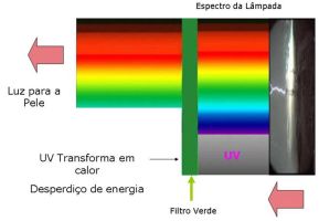 A tecnologia IPL emprega um filtro que deixa passar o comprimento de ondas a partir da faixa desejada (verde, neste caso). A luz UV, sendo bloqueada pelo filtro, transforma-se em calor, e, consequentemente, é necessário usar altas energias, desperdiçando energia e produzindo aquecimento do punho.
